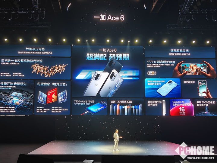 一加 Ace 6搭载骁龙8至尊版移动平台,最高配备16GB LPDDR5X Ultra内存和1TB UFS 4.1闪存,同样搭载全新「电竞三芯」,165Hz超高刷+1.5K高分辨率护眼屏。超声波指纹+智能音频放大器也是一加15同款的汇顶方案。